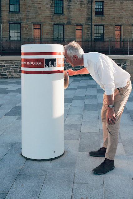 Animated images of a shuttle work their way up the west side of a chimney and then fade to reveal on the southerly side an engineers drawing of a cross section of the loom used in the Weavers Triangle factories. This fades to reveal a rhythmic punch card pattern on the east side.